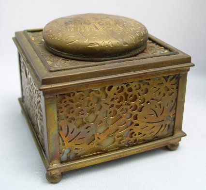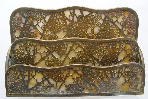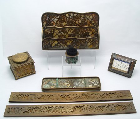 6 PIECE TIFFANY STUDIOS ''GRAPEVINE'' DESK SET: Each piece is marked Tiffany Studios New York. The set includes 1) Letter holder 1008. 2) Calendar 930. 3) Pen Tray 904 4) Inkwell 844, with glass insert and hinged lid. 5) Blotter ends (small dent) 999. 6) Pen brush 981. Areas of heavy oxidized verdigris patina. Bronze with original slag glass. Please note the letter holder has a crack in the glass.