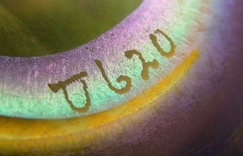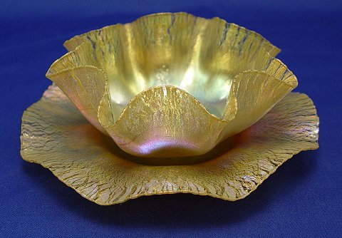 TIFFANY FINGER BOWL AND UNDERPLATE: Gold Favrile stretch glass with ruffled rims. Both pieces are signed L.C.T. U620. Bowl is 5 1/2'' dia., plate is 6 3/4'' dia. No chips or cracks.
