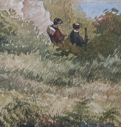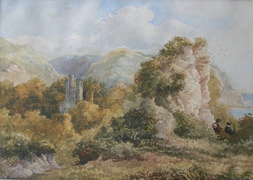 HOLDING, John, (English, 19th C): Landscape with castle and figures on the coast, W/C, sight size is 9 1/2'' x 13 1/2'', signed lower right, titled faintly verso ''Steep ? Castle''.