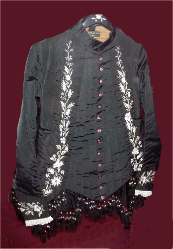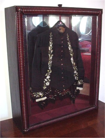 VICTORIAN SILK VOILE EMBROIDERED JACKET: CA. 1881-1882. Exquisite embroidery on black silk. Original label, buttons and tassels. Housed in a carved mahogany airtight shadow bow frame with mirror back and turn knob. 37''h. x 31'' 10'' deep.