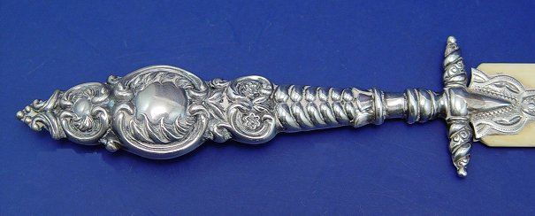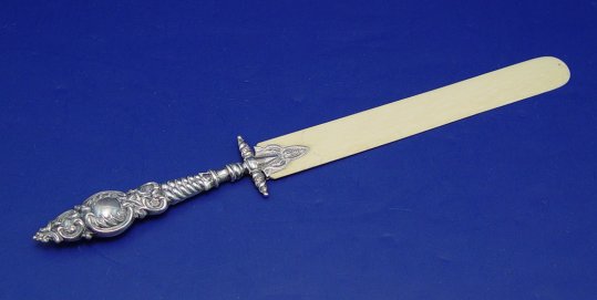 ORNATE STERLING AND IVORY PAGE TURNER: Sterling handle, ivory blade. Illegible sterling hallmarks include lion passant and an anchor. 11 1/2''l.