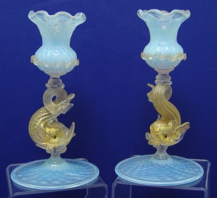 PAIR OF VENETIAN GLASS CANDLESTICKS: Fiery opalescent blown glass candle holders. The dolphin fish stems are gold specked. Approx. 6''h. No chips or cracks.