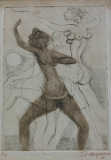 ANGUIANO, Raul, (American, 1909-): ''Strip Tease'', Etching, sight size measures 15 1/4'' x 10 1/2'', signed lower right, dated 69', titled in pencil and marked lower left Artist Proof. Condition - Staining in the top margin.