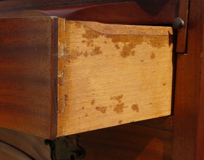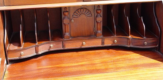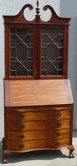 SERPENTINE FRONT MAHOGANY SECRETARY BOOKCASE: Upper section bookcase, lower slant front section with interior drawers and cubicles. 4 drawers, paw feet. 7'h. x 3' x 1.5'.