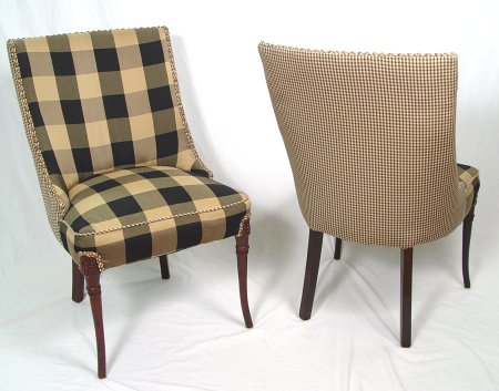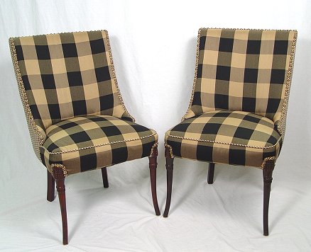 PAIR OF FEDERAL STYLE MAHOGANY SIDE CHAIRS: Carved mahogany front legs, back legs have a slight angle. Custom decorator upholstery with brass heads. 36''h, 21''w.