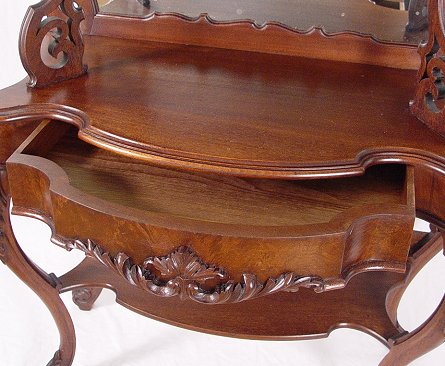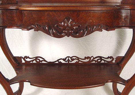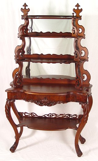 MID 19TH CENTURY ROCOCO REVIVAL ETAGERE: 5 shelves with mirrored back, center drawer with intricate applied carving, carved cabriole legs ending with carved foot, 70''h, 19'' depth x 40''. Est. $700/900**