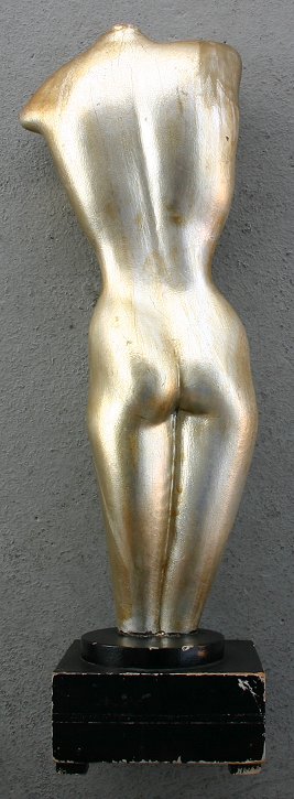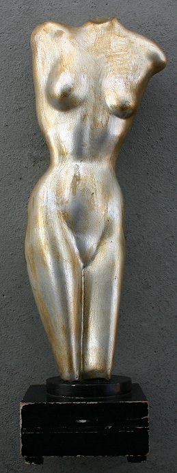 DECO ERA CARVED AND GILDED FEMALE NUDE TORSO: 20''h., Schultheis Art Galleries label affixed to bottom of black painted plinth. Condition - Silver gilt with some wear and areas of repair along with areas of nicotine staining.