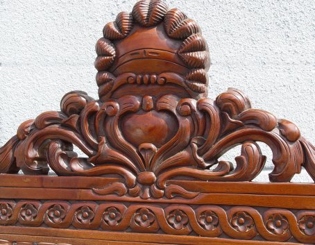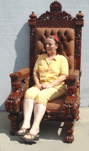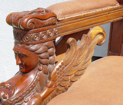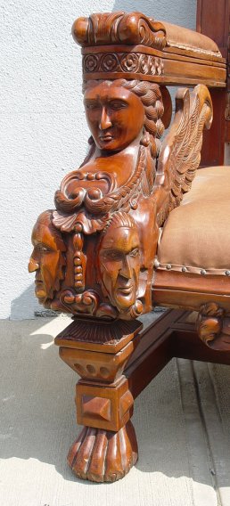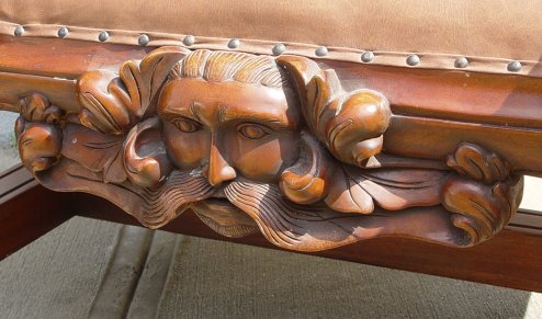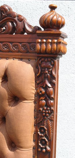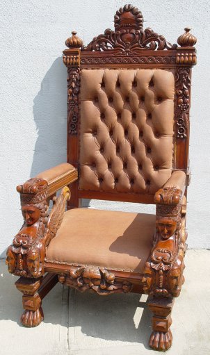 OUTRAGEOUS CARVED INDONESIAN MAHOGANY THRONE CHAIR: Tufted leather like upholstery, carved to death frame. 67''h, 33'' x 31''.