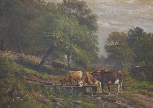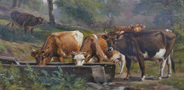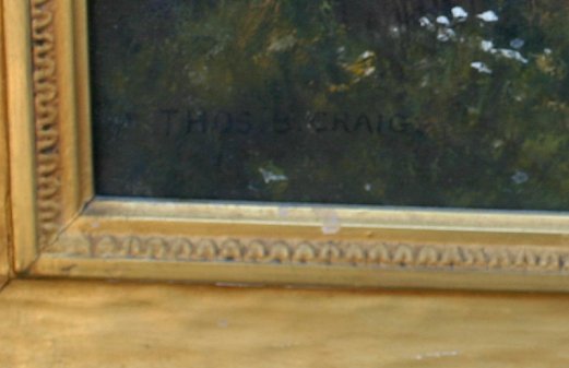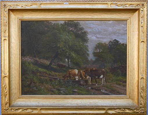 CRAIG, Thomas Bigelow, (American, 1849-1924): ''At the Water Trough'', O/C, 20'' x 28'', signed lower left, signed and titled on canvas verso, encased in original hand carved and gilded period American frame with some wear and missing some gilt, 30 1/2'' x 38'' overall. Est. $3000/5000**