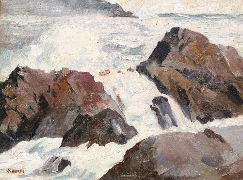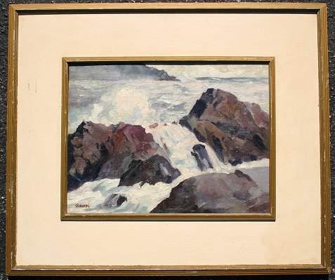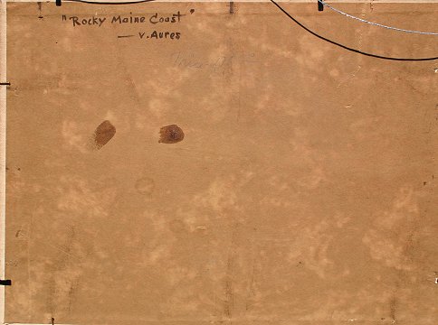 AURES, Victor (American, 1894-?): ''Rocky Maine Coast'', O/CB, 12'' x 16'', signed lower left, encased in original painted frame with wear, 21 1/4'' x 25 1/2'', titled and signed verso. Condition - Needs cleaning. Est. $800/1200**