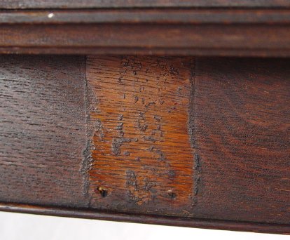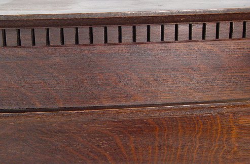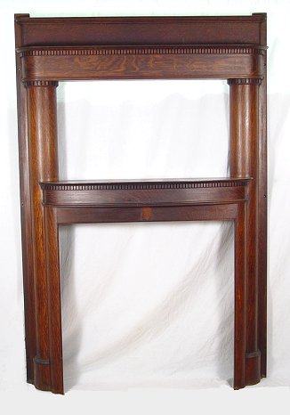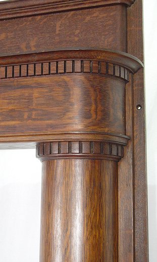 WONDERFUL SEVEN FEET TALL TIGER OAK FIREPLACE MANTLE: Featuring half columns and bowed mantle shelf, mirrored center. Approx. 91''h. x 5'w. overall. Fire opening is approx. 42'' x 41''.