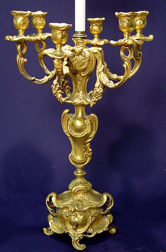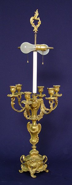 PAIR OF ROCOCO GILT METAL CANDELABRA LAMPS: 6 arm candelabra type lamp, 2 sockets, matching rococo finials, shades included. 36''h. overall.
