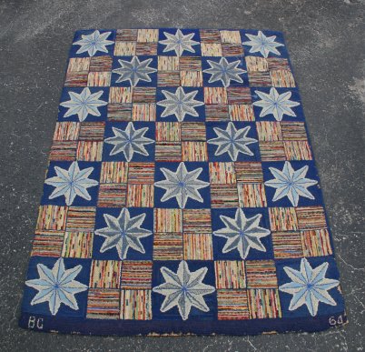 VINTAGE AMERICAN FOLK ART HOOKED RUG IN A SNOWFLAKE OR STAR DESIGN: Marble Head, Mass. The fabric was stripped and the rug made by the consignor's mother-in-law, born in 1888. Approx. 4'10'' x 3'4''. Dated 64, initialed BC. Worn edge.