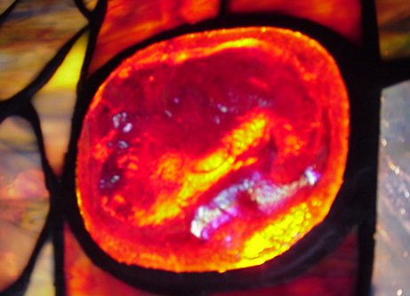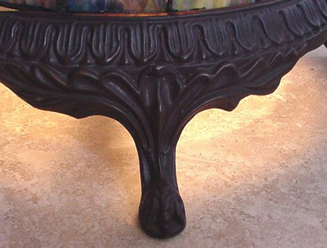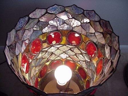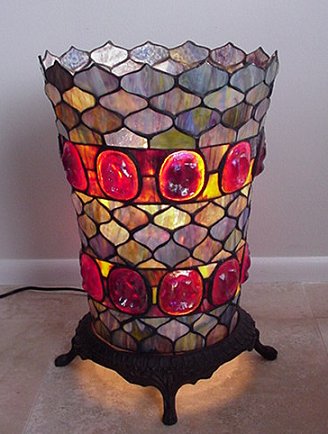 LEADED GLASS TIFFANY STYLE UP-LIGHT: Ornate metal stand. 19''h. 13'' dia. at rim. Contemporary.