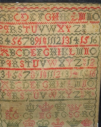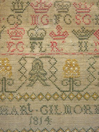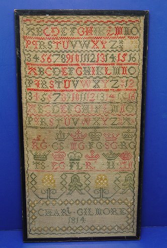 19th C SAMPLER: Worked by Charlotte Gilmore 1814. Predominate green and red coloration. Alphabet, numbers and crowns with two trees on linen. ''CHARLt. GILMORE 1814''. Approx. 17 1/4'' x 9 1/4''. Framed under glass.