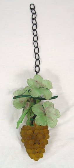 HANGING GLASS GRAPE LAMP: Single cluster of satin glass grapes, 5 large (4 1/2'' dia.) glass leaves. Lamp is approx. 11''l. excluding the chain.
