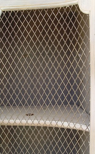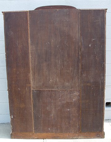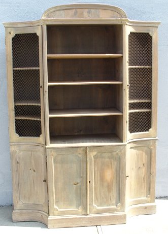 PICKLED PINE BREAKFRONT CHINA CABINET: Ca. First half of the 20th century. One piece with top center of open shelving flanked by sides with wire mesh doors, cabinet base. 76''h. x 54'' x 17''.