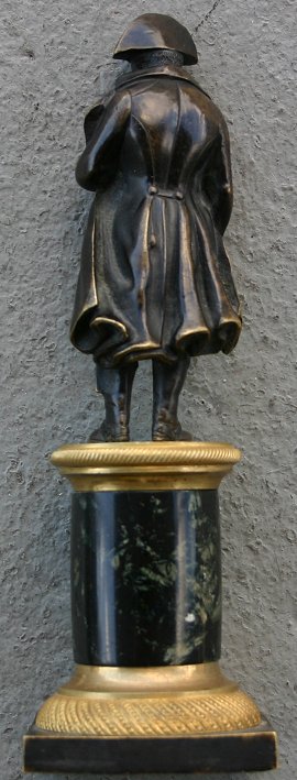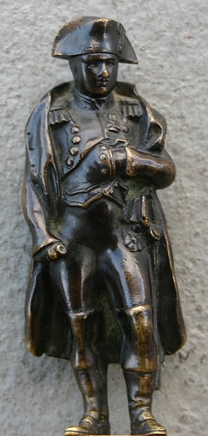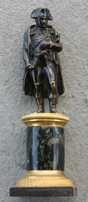 GRAND TOUR LATE 19TH/EARLY 20TH CENTURY NAPOLEONIC BRONZE MINIATURE: Figure of Napoleon standing atop of a dore bronze and polished granite pedestal, 6'' height, some wear to patina and some dents mixed throughout.