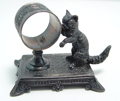 CAT FIGURAL NAPKIN RING BY JAMES TUFTS: Victorian silverplate cat at play. 3''h. x 3 3/4''. James Tufts of Boston hallmark.