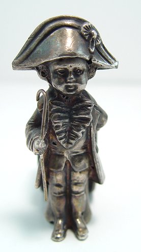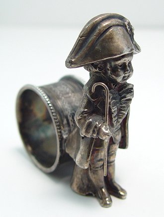 YOUNG PATRIOT BOY FIGURAL NAPKIN RING: Victorian silverplate young boy in aristocratic finery. No hallmark, worn condition. 3 1/2''h.