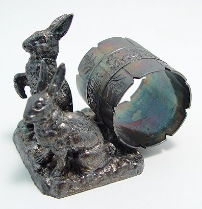 TWO RABBITS FIGURAL NAPKIN RING: Victorian silverplate pair of rabbits. Embossed on the ring. 2 1/2''h. x 3 1/4''. No identifying hallmarks.