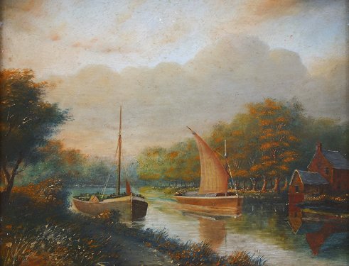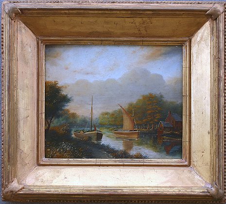 GOOD 19TH CENTURY DUTCH O/B CANAL SCENE: 8'' X 9 1/2'', illegibly signed lower left, encased in a period deep dish gilt molding with heavy wear and repair to the corners, 13'' x 15''. Condition - Needs cleaning.