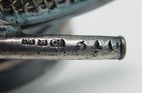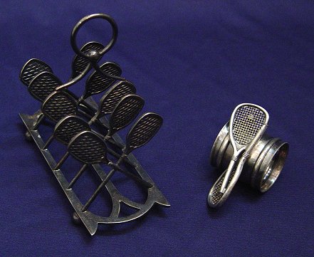 MERIDEN VICTORIAN RACKET FIGURAL NAPKIN RING: Victorian silverplate pair of rackets, etched floral design on the ring. Hallmarked M.B Co. 1 1/2''h. x 3 1/2''l. Sold with corresponding toast rack.