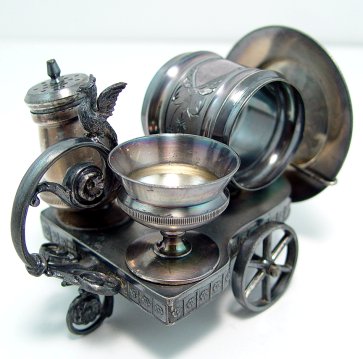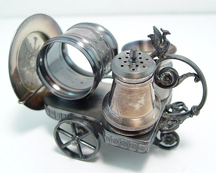 VICTORIAN SILVERPLATE SIMPSON HALL & MILLER NAPKIN RING CONDIMENT CART: Two wheeled cart holds a butter pat, napkin ring, salt, and shaker. Pulls along on two wheels. Please note the shaker pedestal needs to be welded. 3 1/2''h, x 5 1/2''.