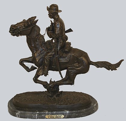 BRONZE SCULPTURE, ''TROOPER OF THE PLAINS'', AFTER FREDERIC REMINGTON: 21'' h., affixed to a polished marble plinth. Est. $400/600**