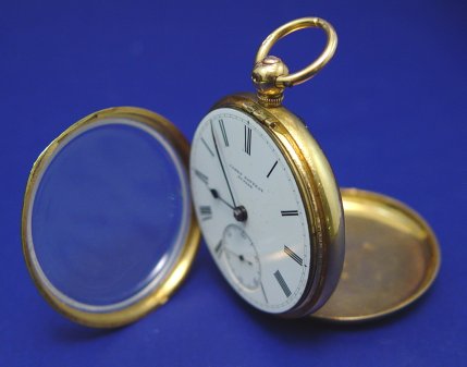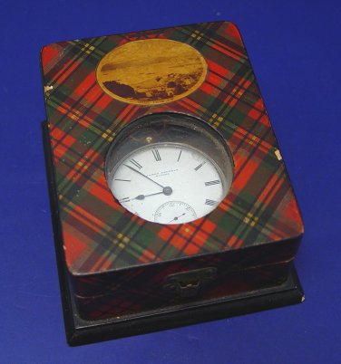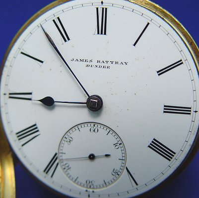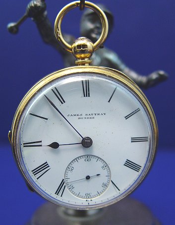 KEY WIND POCKET WATCH BY JAMES RATTRAY, DUNDEE SCOTLAND: Circa early 1800's, 18K gold open face pocket watch, currently keeping time, white porcelain dial marked James Rattray Dundee; black hands, Roman numerals and second sweep; case marked with crown, leopard head (London) H (date) 18 (K) JW (maker), with key. Works marked James Rattray Dundee No 548. Sold in original tartan ware / tartanware presentation box, slight wear to corners and edges, missing top of latch. Watch approx. 1 1/2''dia., box approx. 4'' x 3 1/2'' x 2'' / 1 1/2''h. James Rattray, the watch and clock maker, jeweler, gold and silversmith resided Nethergate, Dundee and the company continues at No. 32 to this day under Rattray & Co.