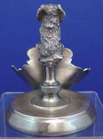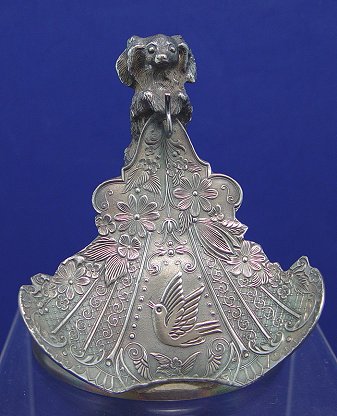 REED & BARTON FIGURAL WATCH STAND: Adorable dog perched on a stand, holding an intricately decorated fan to support the watch. 4''h., marked Reed & Barton 270.