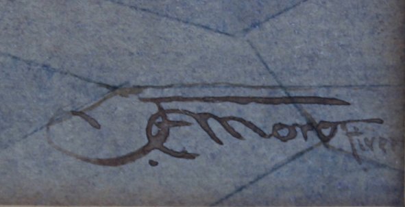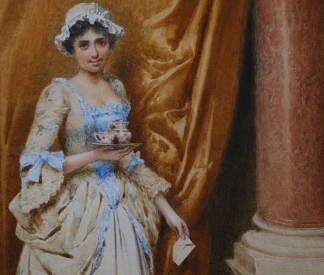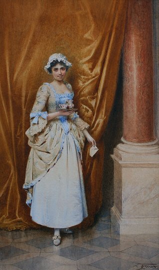 MORO, F., (Italian, 19th C): Young hand maiden with tea service, W/C, 14 3/4'' x 9'', signed lower right ''F. Moro'' probably Franz or Fredrico, Firenze, encased in original period gilt frame with gold overpaint with repair.