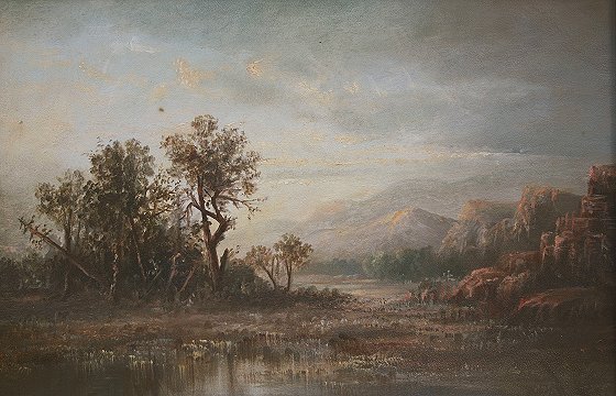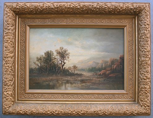 19TH CENTURY AMERICAN SCHOOL LANDSCAPE: O/B, 12'' X 18 1/2'', no visible signature, encased in over-painted period embossed gilt frame with some repair and wear. Condition - Some minor flecks of paint loss, needs cleaning.