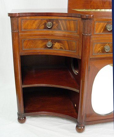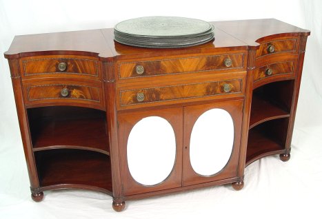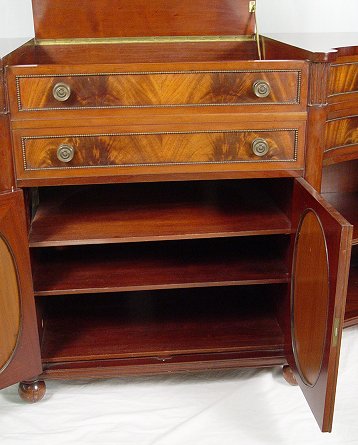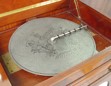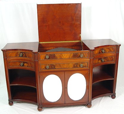 CRITERION DISK MUSIC PLAYER IN CUSTOM BUILT MAHOGANY CABINET: Specially constructed cabinet with beautiful flame grain mahogany veneer, lift top player compartment with faux drawer front over double mirrored front doors hiding shelved storage for disks, curved sides with one drawer over two open shelves, electrical operation, 66 1/2''w. x 24 1/4''d. x 35 1/2''h. Sold with 27 disks, 20 1/2''dia.