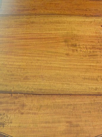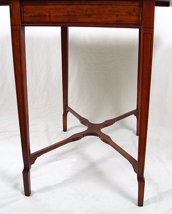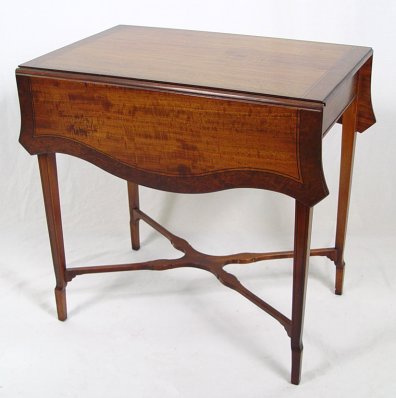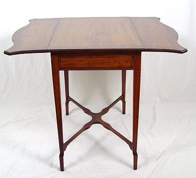 MAHOGANY SHERATON STYLE PEMBROKE TABLE: Fine detailing in the shaped leaves, banding and string inlay, blind drawer front, cross stretcher, and tapered legs. Beautiful condition. 28''h, x 28''x 19''w. 37'' wide when leaves are open.