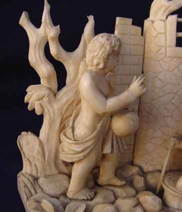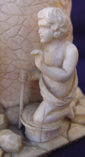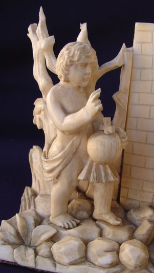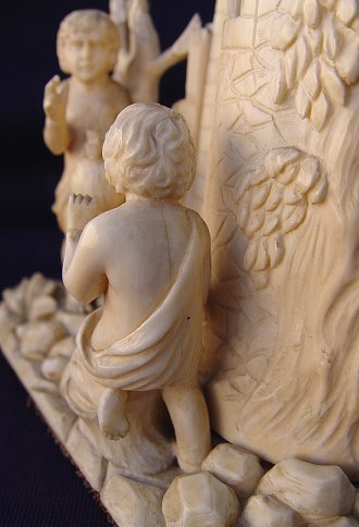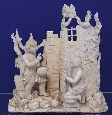 CONTINENTAL IVORY CARVED GROUP: Highly detailed scene of a blessing between 2 young men. Note the cobblestones and structure. 4 1/4''h. x 4''.
