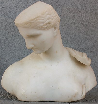 TURN OF THE CENTURY CARVED ALABASTER MAIDEN'S HEAD BUST: 9'' Height, neo-classically styled with touches of cubism. Condition - Needs cleaning.