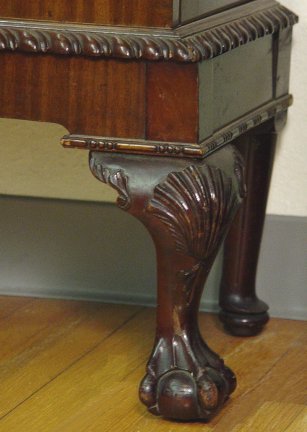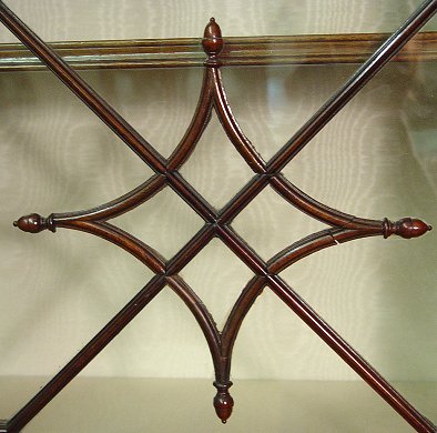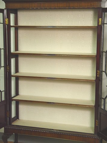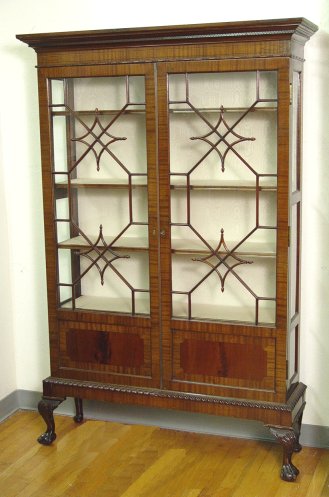 EDWARDIAN MAHOGANY DISPLAY CABINET: Banded mahogany cabinet. Glass front doors with unusual star shaped fretwork. Straight cornice, carved base and cabriole legs. 71 1/2'' x 47 1/2'' x 12''. Est. $1600/2000**