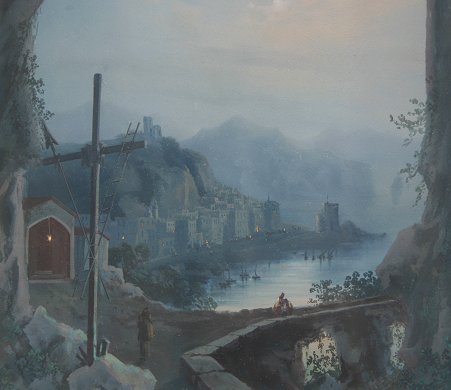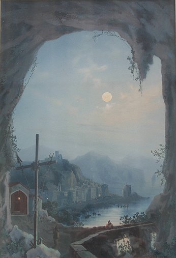 LATE 19TH EARLY 20TH CENTURY NOCTURNAL GOUACHE PROBABLY OF THE BAY OF NAPLES/AMALFI: 13'' x 9'', no visible signature, encased in later ebonized and gilded molding with wear, 21 1/2'' x 14''.
