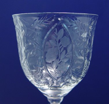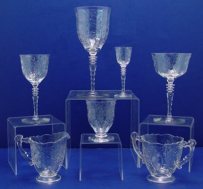HIGH QUALITY CUT CRYSTAL STEMWARE: 44 piece, possibly Libby Rock Sharp. Intricate etched design on 5 goblets, 10 wine, 10 claret wine, 11 juice, or cocktails, 6 cordials, and creamer and sugar.