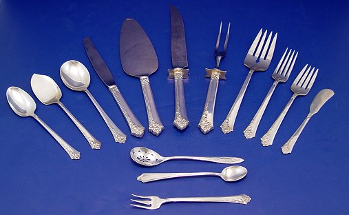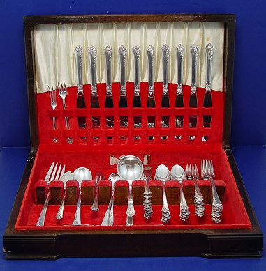 HEIRLOOM ''DAMASK ROSE'' STERLING FLATWARE: 68 pieces to include 10 dinner forks, 10 salad forks, 10 dinner knives, 13 teaspoons, 10 butter knives, master butter, lemon fork, gravy ladle, 2 table spoons, meat fork, 2 piece carving set, sugar spoon, 2 cocktail forks, and a pie server. No monogram, sold in the wooden box.