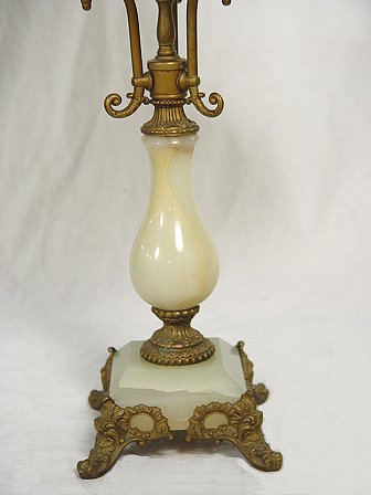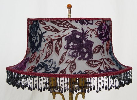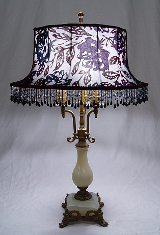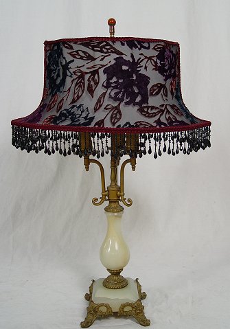 1920 - 30'S ONYX TABLE LAMP WITH CUSTOM CUT VELVET AND GLASS BEADED SHADE: Stunning wine colored newly made custom cut velvet shade with black glass beaded fringe. Onyx candelabra type base. 31''h. overall. Est. $220/350**