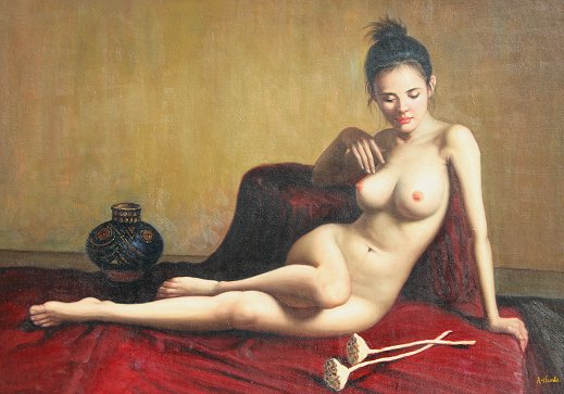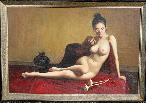 CLAUDIE, A., (Japanese, 20th C): Young female nude with porcelain vessel, reclining on red cloth, O/Canvas Board, 24'' x 36'', signed lower right, encased in custom antiqued silver gilt and ebonized with wear, 27'' x 39''.