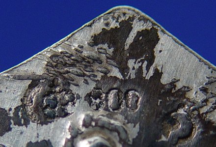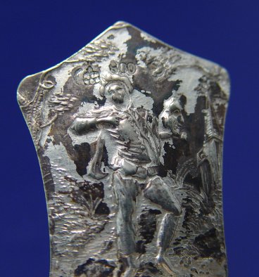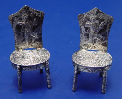 PAIR OF GERMAN MINIATURE SILVER CHAIRS: Repousse image of Venetian character in masquerade on the back, and courting scene on the front. Bears the crescent moon, crown and sickle German hallmark along with 800. 2 1/4''h.
