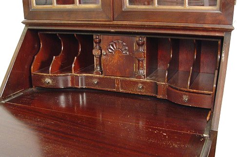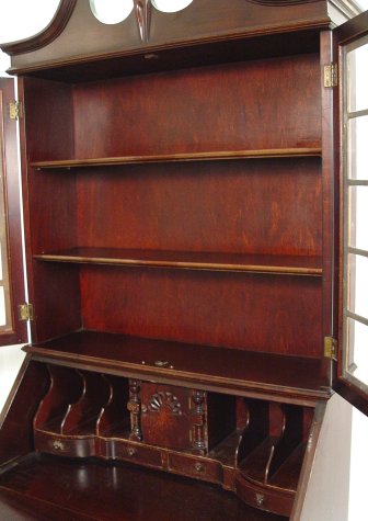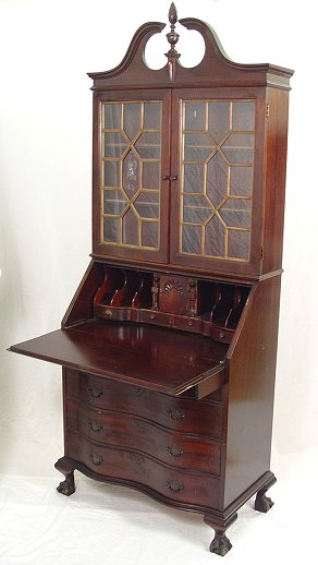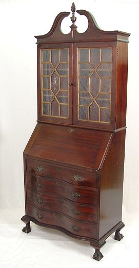 MAHOGANY SECRETARY DESK: Glass front bookcase over slant front desk fitted with interior drawers and cubicles over a four drawer serpentine front chest. Ball and claw feet all the way around. Flame finial at the crown. 82''h. x 31'' x 17''.