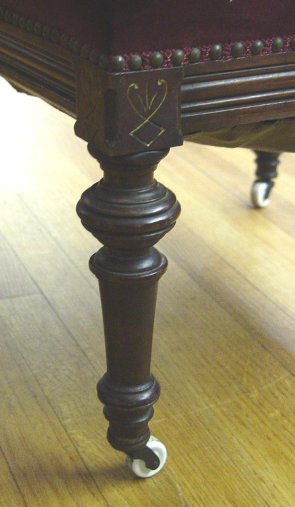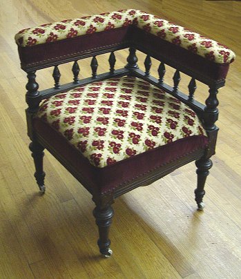 VICTORIAN HERTER QUALITY CORNER CHAIR: Turned spindle columns between upholstered rail and seat. Original porcelain casters. 28''
