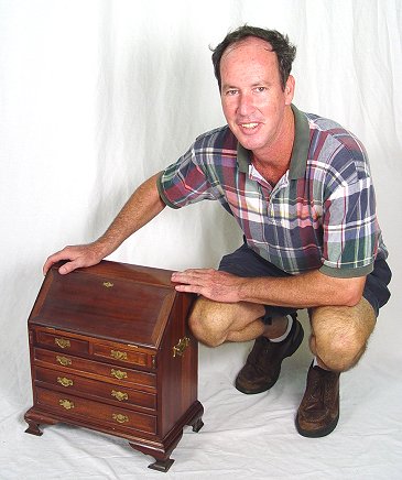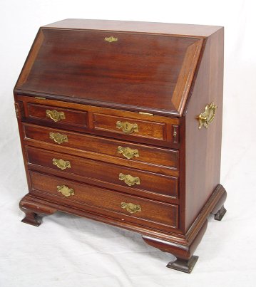 MINIATURE MAHOGANY SLANT FRONT DESK: Finest detail from the interior drawers and slots to the molding around the drawers to the block feet. Brass pulls and handles on the sides. 18''h, x 16'' x 9 1/2''.