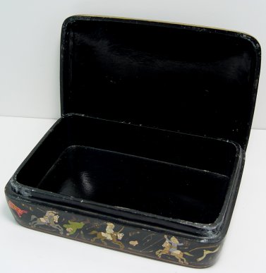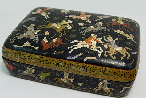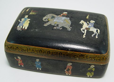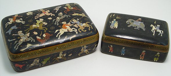 2 HAND PAINTED PERSIAN LACQUERED BOXES: The larger is painted horse and figures in battle, 3''h. x 9 1/2'' x 6 1/4''. The smaller is painted in elephant and figures, 2 1/2''h, x 7'' x 4 1/4''. Black ground.