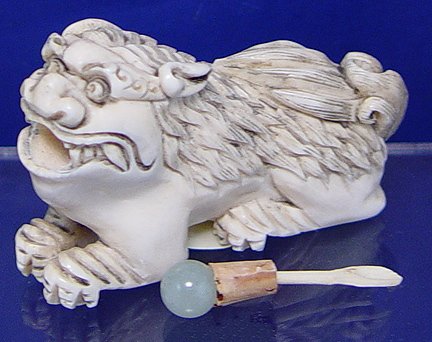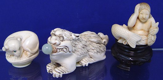CARVED IVORY SNUFF BOTTLE AND NETSUKES: 2 1/2''l. snuff bottle in the form of a foo lion, the spoon has a jade ball handle. A Mermaid netsuke, and a dog netsuke, each 1 1/2''h.