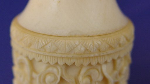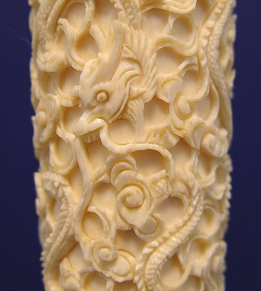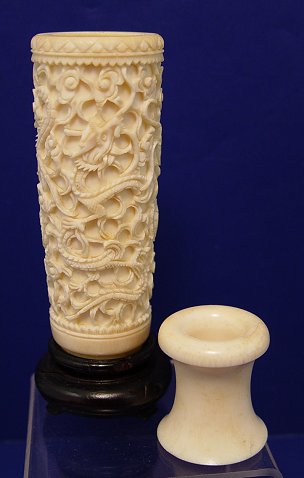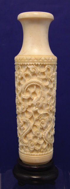 IVORY CARVED VASE: Relief carved design of interwoven dragons. Two part construction. 7''h. including wooden stand.